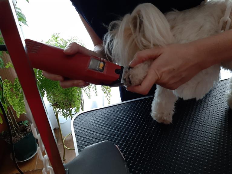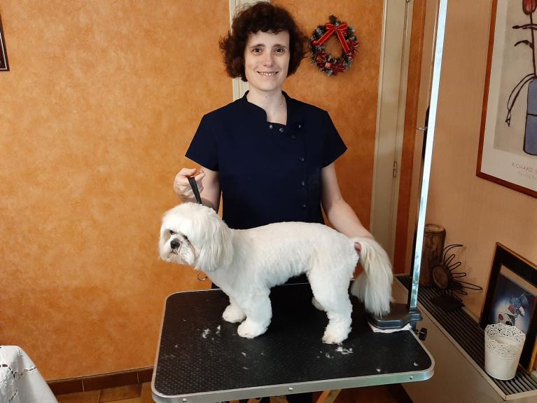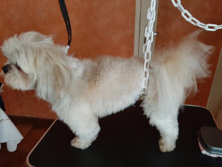 La maîtresse a opté pour une coupe mouton, c'est-à-dire une tonte du corps (pas trop courte) et un rafraichissement des pattes aux ciseaux.