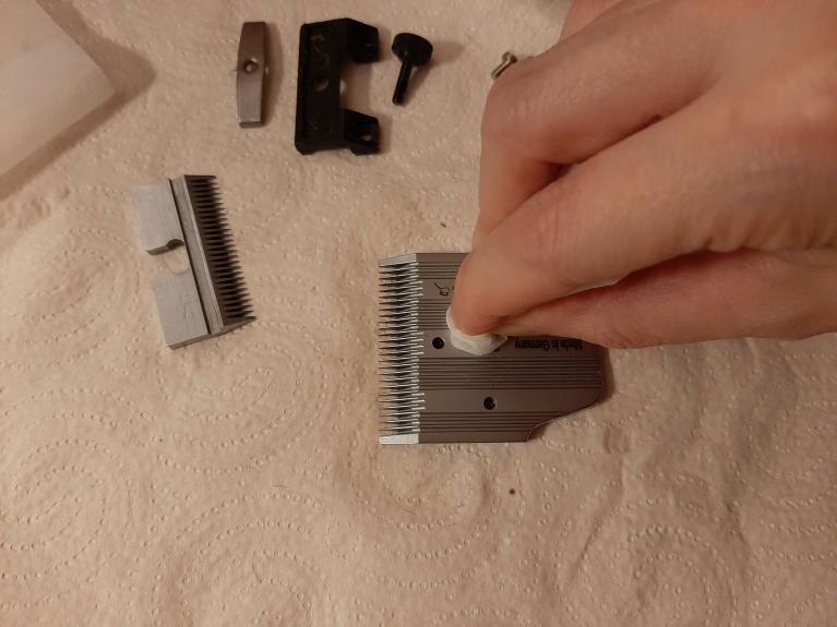 Les poils ont tous été retirés. La tête de coupe est propre et prête à être remontée. Cette opération est très minutieuse. Une tête de coupe mal remontée peut blesser un chien.